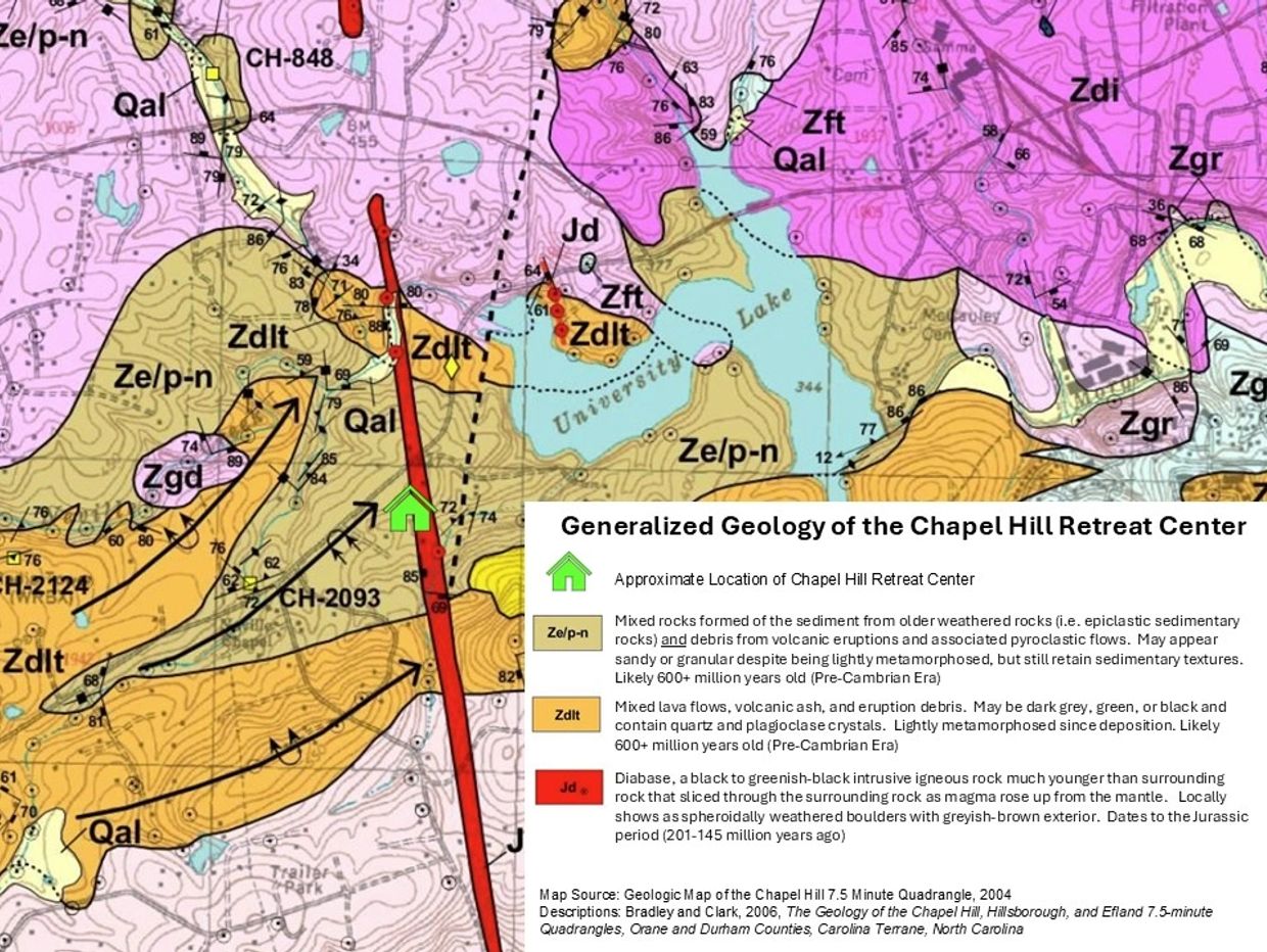 The figure above, "Generalized Geology of the Chapel Hill Retreat Center," (N. Rashid, 2025) depicts the broad geological characteristics of the area where the retreat center is based. Rashid, a geological expert, assembled this summary after a "geology walk" of the property in May 2025. A geology walk is a great way to explore the landscape, learn about the rocks and their geological context, and connect with the natural world while understanding how rocks, minerals, and geological processes shaped the area.